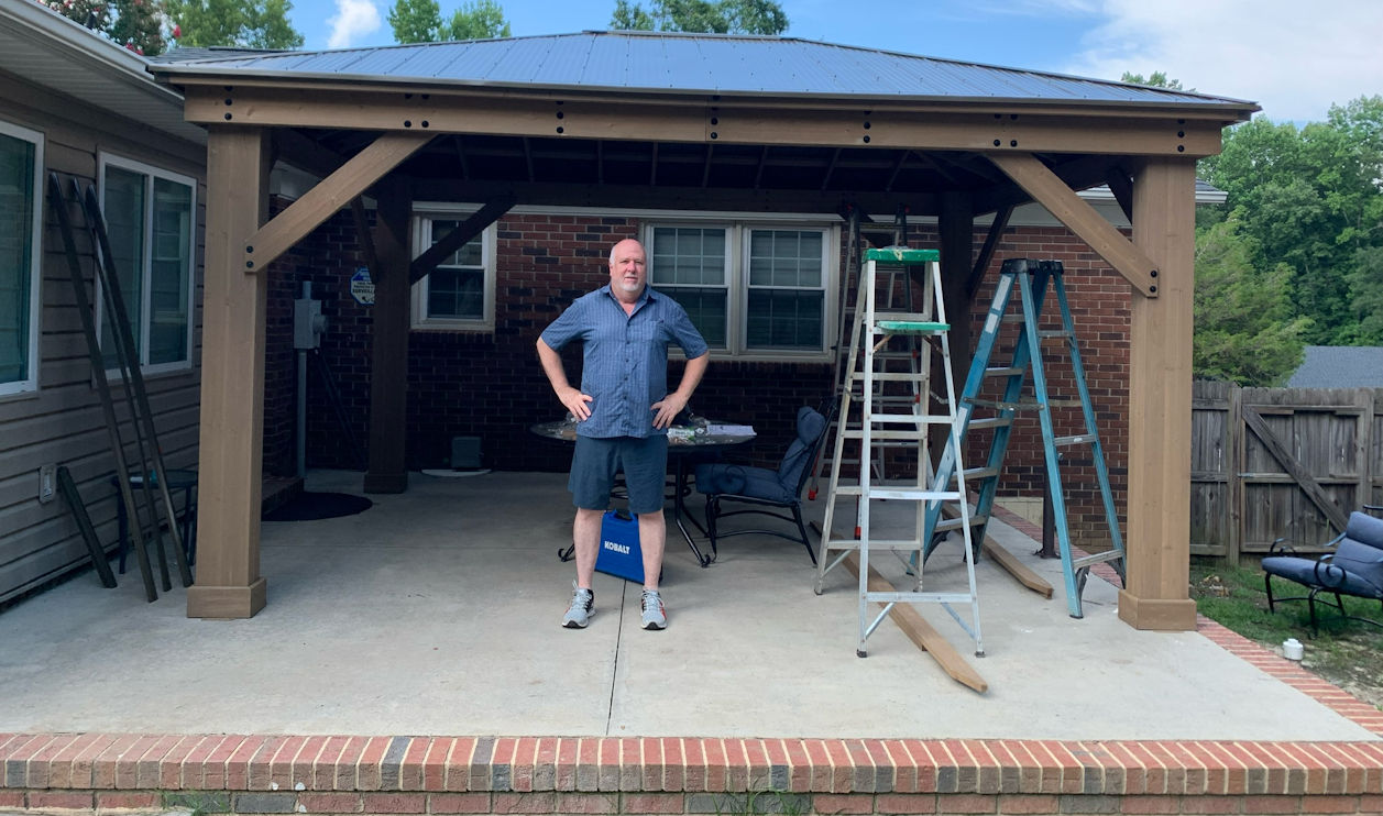 The homeowner’s goal was to be able to walk outside into a covered area, but due to how the home was built, additional construction to the roof line wasn’t practical or affordable, so we came up with this alternative. Once the gazebo was constructed, we lifted it onto pedestals to raise it a few inches so it would overlap the gutters. It doesn’t rest on the gutters; it is simply for runoff and so the homeowner can exit during a rainstorm and not get wet.